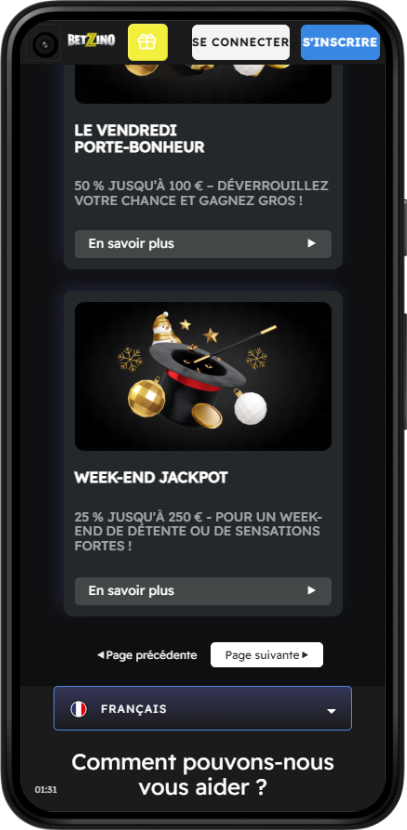 Le week-end est synonyme de détente et de divertissement. Le bonus week-end Betzino a été conçu pour transformer ces deux jours en un véritable événement. Profitez d’un bonus pouvant atteindre 1 400 € et de 50 tours gratuits à utiliser sur une sélection de machines à sous. Que vous soyez adepte des jeux classiques ou des titres live, ce betzino promo code spécial week-end vous assure un départ tonique pour vos sessions de paris sportifs ou de jeux en ligne. Vous pouvez jouer aux machines à sous sur l’application mobile Betzino.